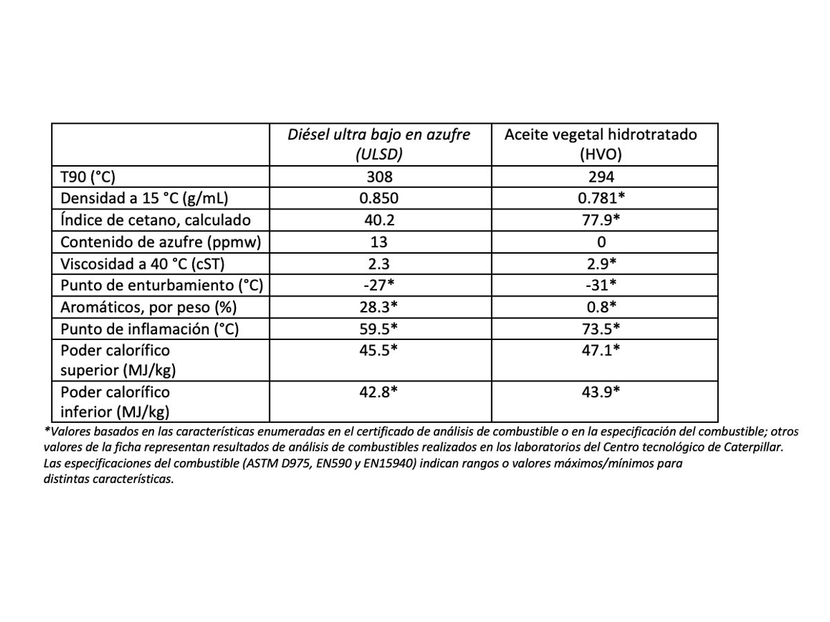 Durante décadas, Caterpillar ha estado monitoreando el desarrollo de combustibles renovables y alternativos, y la empresa participa en el desarrollo de especificaciones adecuadas para garantizar la exitosa aplicación de estos combustibles en motores Cat®. Los combustibles líquidos renovables más comunes y disponibles se derivan de recursos renovables como cultivos plantados (soya, palma, colza, etc.), aceite de cocina usado, grasa animal, biomasa, algas y otros. Según el modelo GREET utilizado por la Junta de recursos del aire de California (CARB), los biocombustibles renovables como el biodiésel y el HVO pueden reducir las emisiones de GEI del ciclo de vida. Su proveedor de combustible puede ayudarle a determinar qué biocombustibles ofrecen la mayor reducción de GEI1,2. Una forma de combustible renovable, el aceite vegetal hidrotratado (HVO), también llamado Diésel renovable (RD), se obtiene a partir de grasas y aceites vegetales y animales mediante un proceso de hidrotratamiento.