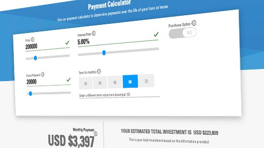 ¿Ya esta planeando alquilar o financiar una máquina específica? No hay problema. Use la calculadora de pagos para encontrar lo que funciona en su presupuesto mensual o vea las opciones una al lado de la otra para comparar.