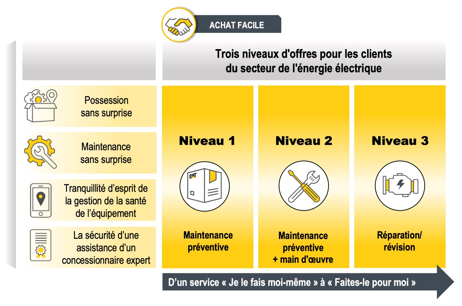 Avec les CVA, l'accent est mis sur ce que nous livrons : un résultat pour le client, tel qu'un entretien sans problème ou une protection du moteur. Il s'agit d'un contrat de service axé sur le cycle de vie qui se concentre sur les promesses de valeur : vendre au client des pièces détachées ou des pièces et de la main-d'œuvre.
