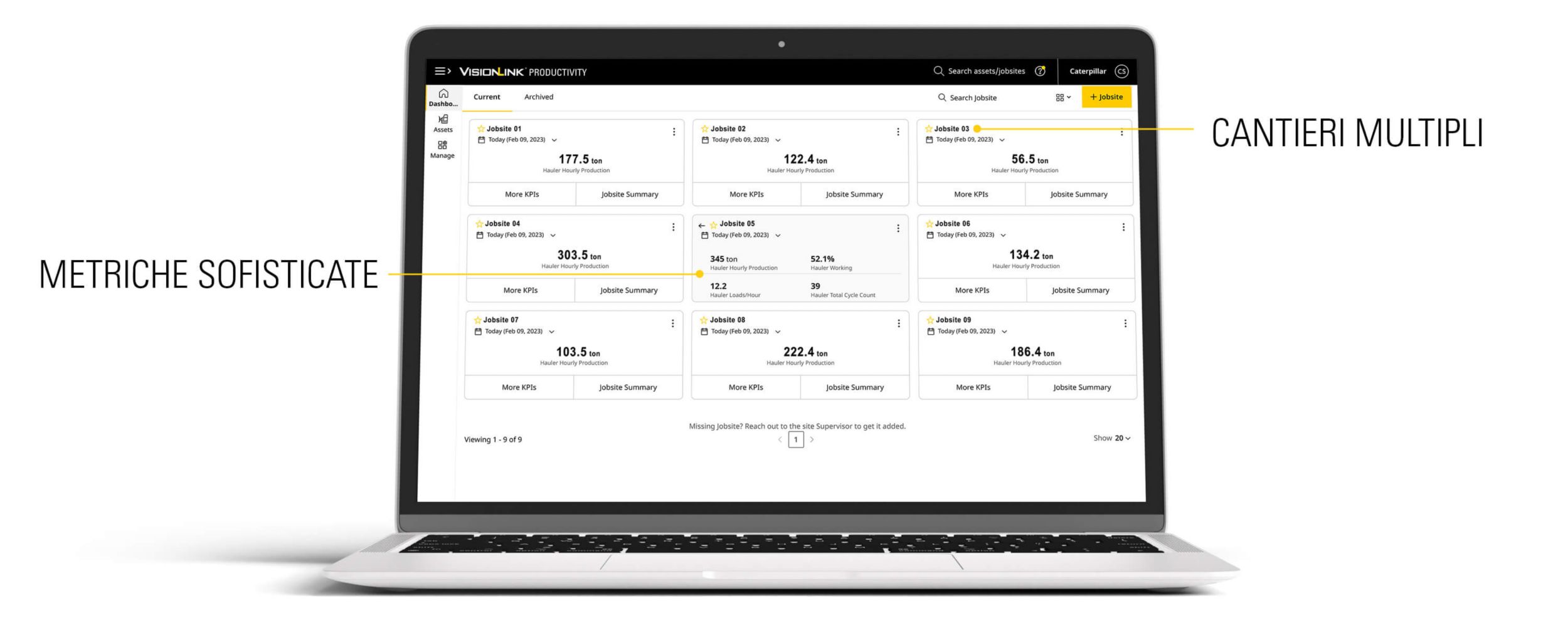 VisionLink® Productivity aggiunge una serie di funzionalità a VisionLink. È una piattaforma su cloud che raccoglie e analizza dati di macchine e cantiere per darti il quadro completo su risorse e progressi. Progettata per miniere, edilizia pesante, agricoltura, asfaltatura e gestione dei rifiuti, aiuta a tenere traccia del lavoro e finire in tempo.