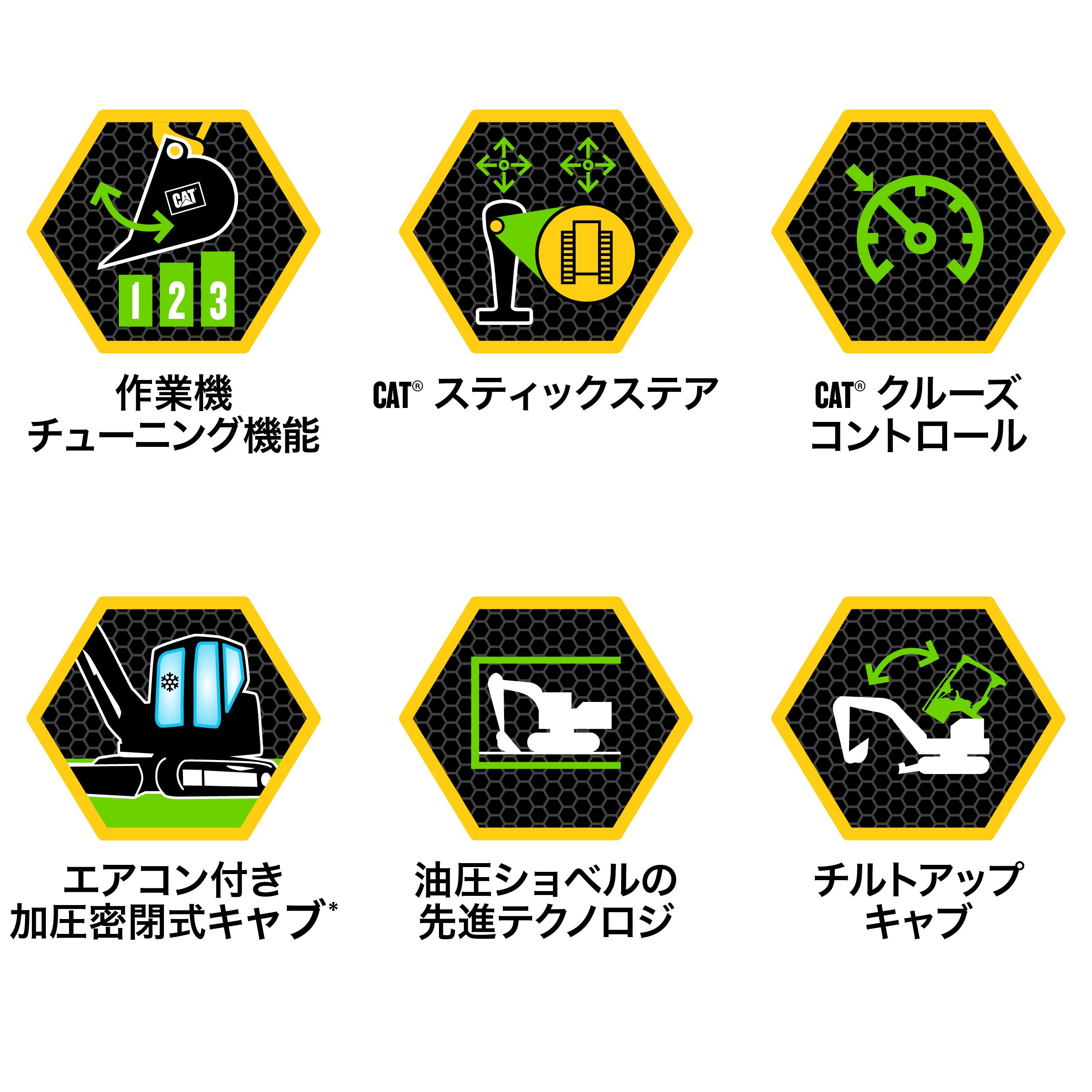 Cat®次世代ミニ油圧ショベルは、高レベルの操作性、快適さ、性能を実現しています。このシリーズは、業界初の機能やテクノロジーを多数搭載しており、作業をこれまで以上に速く、正確に行うために、完全に再設計されました。